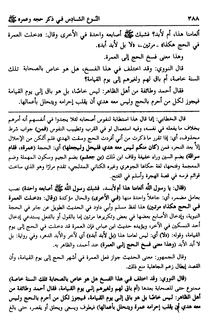 "قال النووي: وقد اختلف في هذا الفسخ هل هو خاص بالصحابة تلك السنة خاصة" ممنوع حتى للصحابة بعدها "أم باق لهم ولغيرهم إلى يوم القيامة، فقال أحمد وطائفة من أهل الظاهر: ليس خاصا بل هو باق إلى يوم القيامة، فيجوز لكل من أحرم بالحج وليس معه هدي أن يقلب إحرامه عمرة ويتحلل بأعمالها" فيطوف ويسعى ويحلق أو يقصر، حتى بالغ