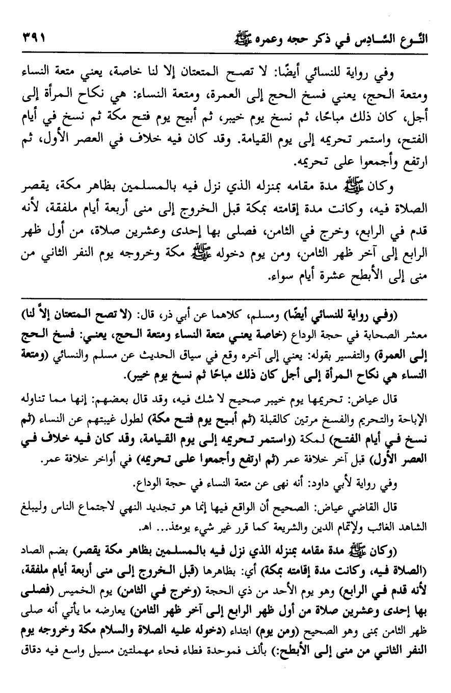 وفي رواية للنسائي أيضا: لا تصح المتعتان إلا لنا خاصة، يعني متعة النسائي ومتعة الحج، يعني فسخ الحج إلى العمرة، ومتعة النساء: هي نكاح المرأة إلى أجل، كان ذلك مباحًا، ثم نسخ يوم خيبر، ثم أبيح يوم فتح مكة ثم نسخ في أيام الفتح، واستمر تحريمه إلى يوم القيامة. وقد كان فيه خلاف في العصر الأول، ثم ارتفع وأجمعوا على تحريمه.