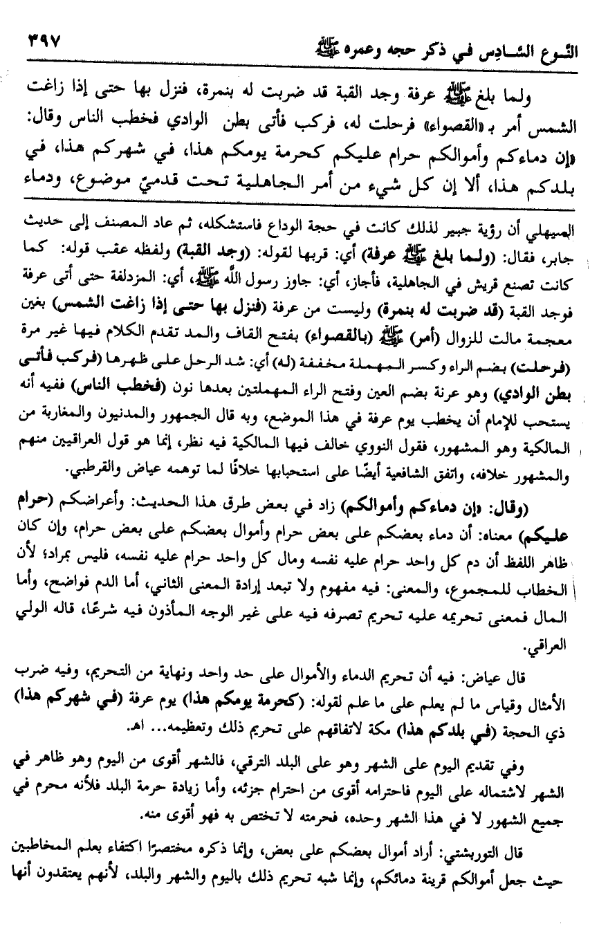 ولما بلغ -صلى الله عليه وسلم- وجد القبة قد ضربت له بنمرة، فنزل بها حتى إذا زاغت الشمس أمر بـ"القصواء" فرحلت له، فركب فأتى بطن الوادي فخطب الناس وقال: "إن دماءكم وأموالكم حرام عليكم كحرمة يومكم هذا، في شهركم هذا، في بلدكم هذا، ألا إن كل شيء من أمر الجاهلية تحت قدمي موضوع، ودماء