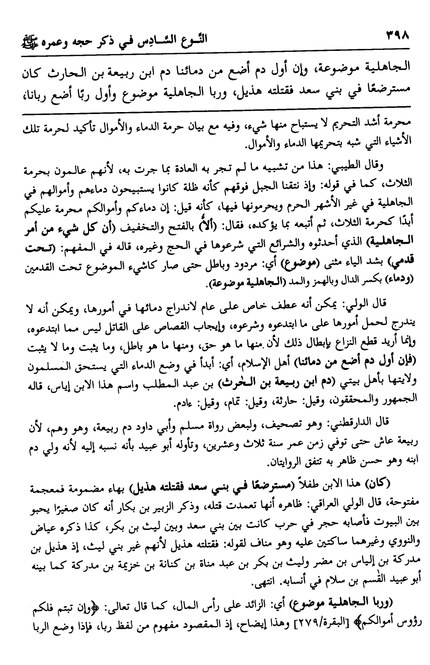 الجاهلية موضوعة، وإن أول دم أضع من دمائنا دم ابن ربيعة بن الحارث كان مسترضعا في بني سعد فقتلته هذيل، وربا الجاهلية موضوع وأول ربا أضع ربانا،