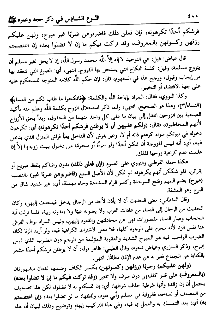 فرشكم أحدا تكرهونه، فإن فعلن ذلك فاضربوهن ضربا غير مبرح، ولهن عليكم رزقهن وكسوتهن بالمعروف، وقد تركت فيكم ما إن لا تضلوا بعده إن اعتصمتم