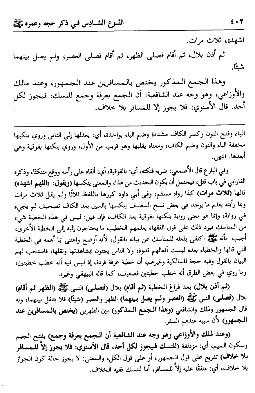 "وعند مالك والأوزاعي وهو وجه عند الشافعية أن الجمع بعرفة وجمع" بفتح الجيم وسكون الميم، أي: مزدلفة "للنسك فيجوز لكل أحد، قال الأسنوي: فلا يجوز إلا للمسافر بلا خلاف" تفريع على قول الجمهور، أو على قول الكل، والمعنى: لا يجوز حالة كون الجواز بلا خلاف، أي: متفقا عليه إلا للمسافر، أما للنسك ففيه الخلاف.