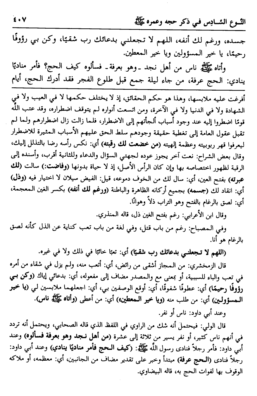 قال الولي: فيحتمل أنه شك من الراوي في اللفظ الذي قاله الصحابي، ويحتمل أنه تردد في أنهم ناس كثير، أو نفر يسير من ثلاثة إلى عشرة "من أهل نجد وهو بعرفة فسألوه" وعند أبي داود: فأمر رجلا فنادى رسول الله -صلى الله عليه وسلم: "كيف الحج فأمر مناديا ينادي" وعند أبي داود: رجلا فنادى "الحج عرفة" مبتدأ وخبر على تقدير مضاف من الجانبين، أي: معظمه، أو ملاكه الوقوف بها لفوات الحج به، قاله البيضاوي.