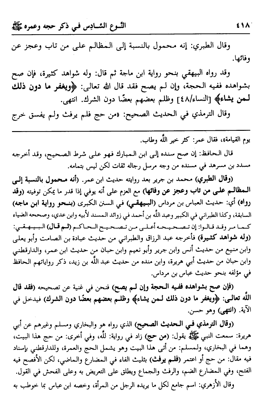 وقال الترمذي في الحديث الصحيح: "من حج فلم يرفث ولم يفسق خرج
