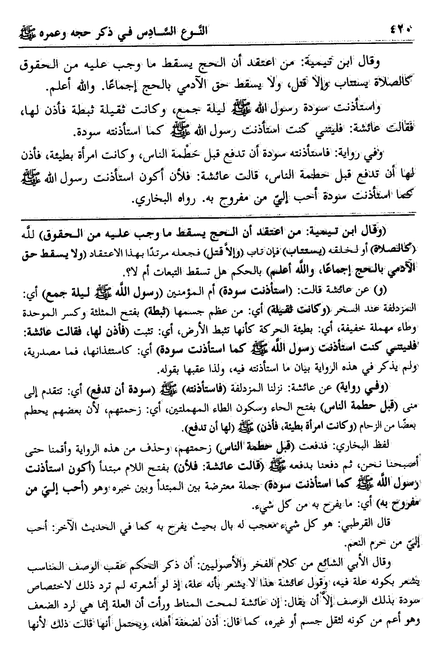 وفي رواية: فاستأذنته سودة أن تدفع قبل حطمة الناس، وكانت امرأة بطيئة، فأذن لها أن تدفع قبل حطمة الناس، قالت عائشة: فلأن أكون استأذنت رسول الله -صلى الله عليه وسلم- كما استأذنت سودة أحب إلي من مفروح به. رواه البخاري.