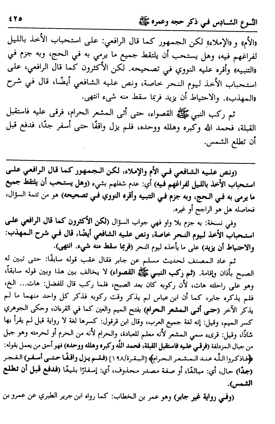 "الأم" و"الإملاء" لكن الجمهور كما قال الرافعي: على استحباب الأخذ بالليل لفراغهم فيه، وهل يستحب أن يلتقط جميع ما يرمي به في الحج، وبه جزم في "التنبيه" وأقره عليه النووي في تصحيحه. لكن الأكثرون كما قال الرافعي، على استحباب الأخذ ليوم النحر خاصة، ونص عليه الشافعي أيضا، قال في شرح "المهذب". والاحتياط أن يزيد فربما سقط منه شيء. انتهى.