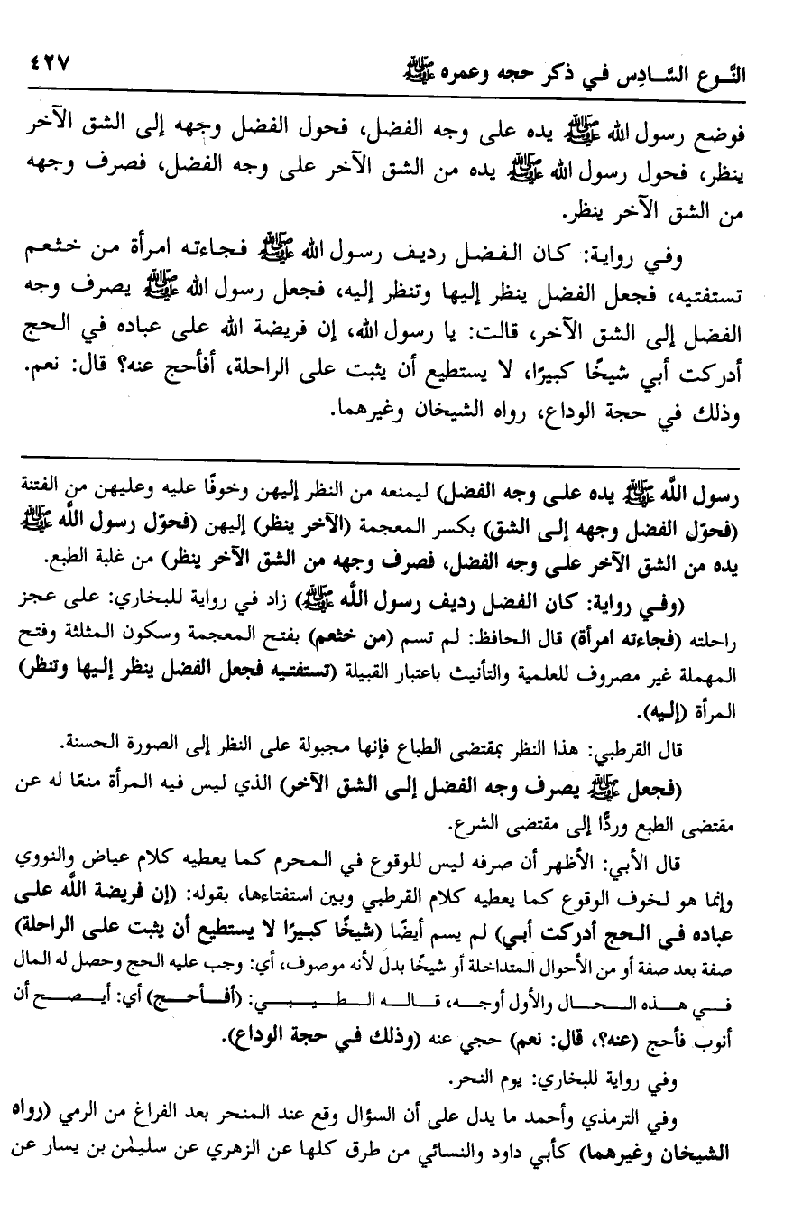 فوضع رسول الله -صلى الله عليه وسلم- يده على وجه الفضل، فحول الفضل وجهه إلى الشق الآخر ينظر، فحول رسول الله -صلى الله عليه وسلم- يده من الشق الآخر على وجه الفضل، فصرف وجهه من الشق الآخر ينظر.