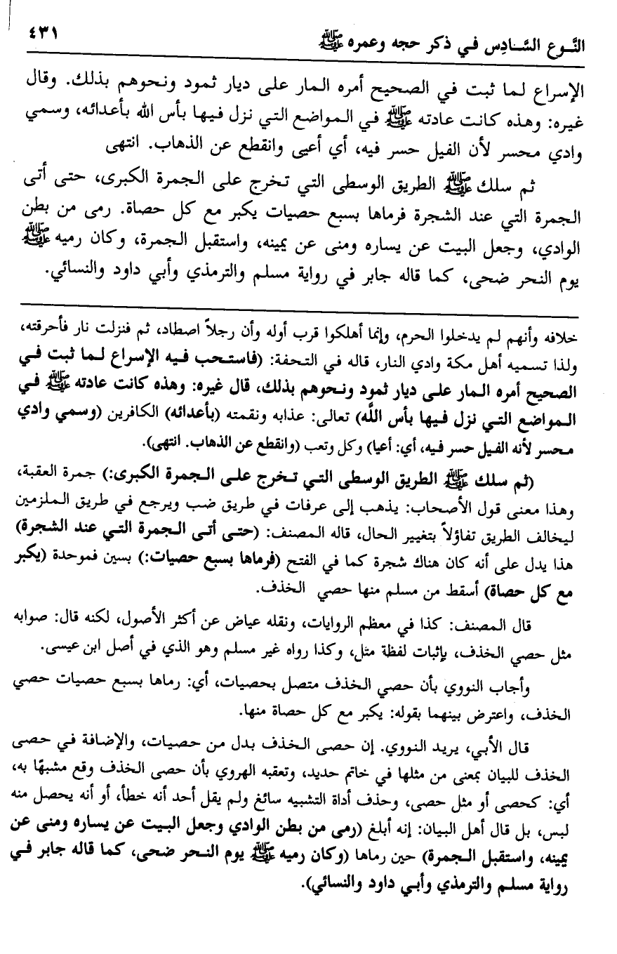 "ثم سلك -صلى الله عليه وسلم- الطريق الوسطى التي تخرج على الجمرة الكبرى:" جمرة العقبة، وهذا معنى قول الأصحاب: يذهب إلى عرفات في طريق ضب ويرجع في طريق الملزمين ليخالف الطريق تفاؤلا بتغيير الحال، قاله المصنف: "حتى أتى الجمرة التي عند الشجرة" هذا يدل على أنه كان هناك شجرة كما في الفتح "فرماها بسبع حصيات:" بسين فموحدة "يكبر مع كل حصاة" أسقط من مسلم منها حصي الخذف.