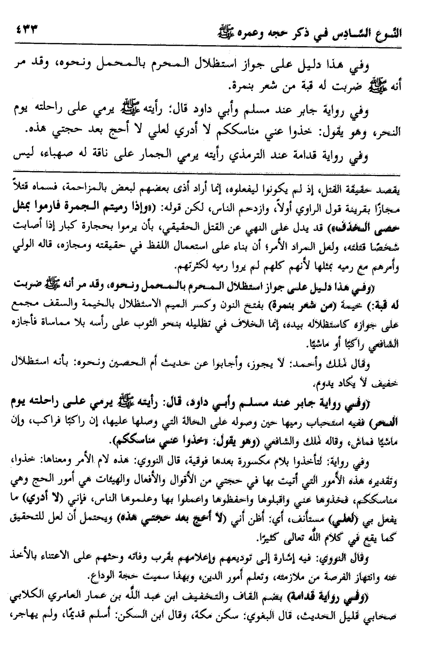 "وفي هذا دليل على جواز استظلال المحرم بالمحمل ونحوه، وقد مر أنه -صلى الله عليه وسلم- ضربت له قبة:" خيمة "من شعر بنمرة" بفتح النون وكسر الميم الاستظلال بالخيمة والسقف مجمع على جوازه كاستظلاله بيده، إنما الخلاف في تظليله بنحو الثوب على رأسه بلا مماساة فأجازه الشافعي راكبا أو ماشيا.