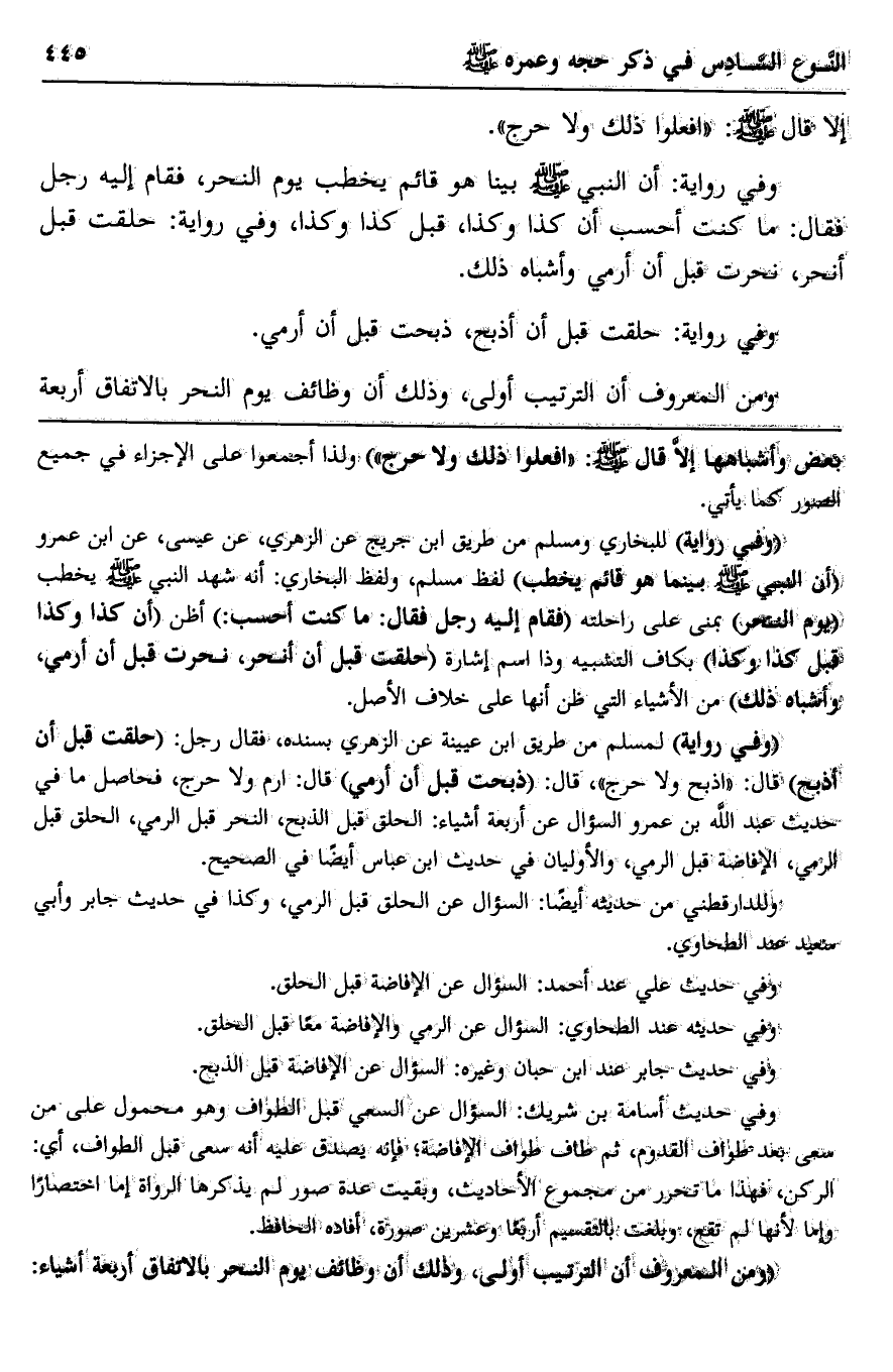 وفي رواية: أن النبي -صلى الله عليه وسلم- بينا هو قائم يخطب يوم النحر، فقام إليه رجل فقال: ما كنت أحسب أن كذا وكذا، قبل كذا وكذا، وفي رواية: حلقت قبل أنحر، نحرت قبل أن أرمي وأشباه ذلك.