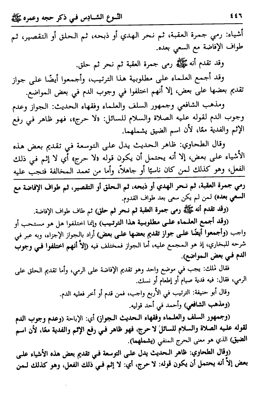 "وقد أجمع العلماء على مطلوبية هذا الترتيب" وإنما اختلفوا هل هو مستحب أو واجب "وأجمعوا أيضا على جواز تقديم بعضها على بعض" أراد بالجواز الإجزاء، وبه عبر في شرحه للبخاري، إذ هو المجمع عليه، أما الجواز فمختلف فيه "إلا أنهم اختلفوا في وجوب الدم في بعض المواضع".