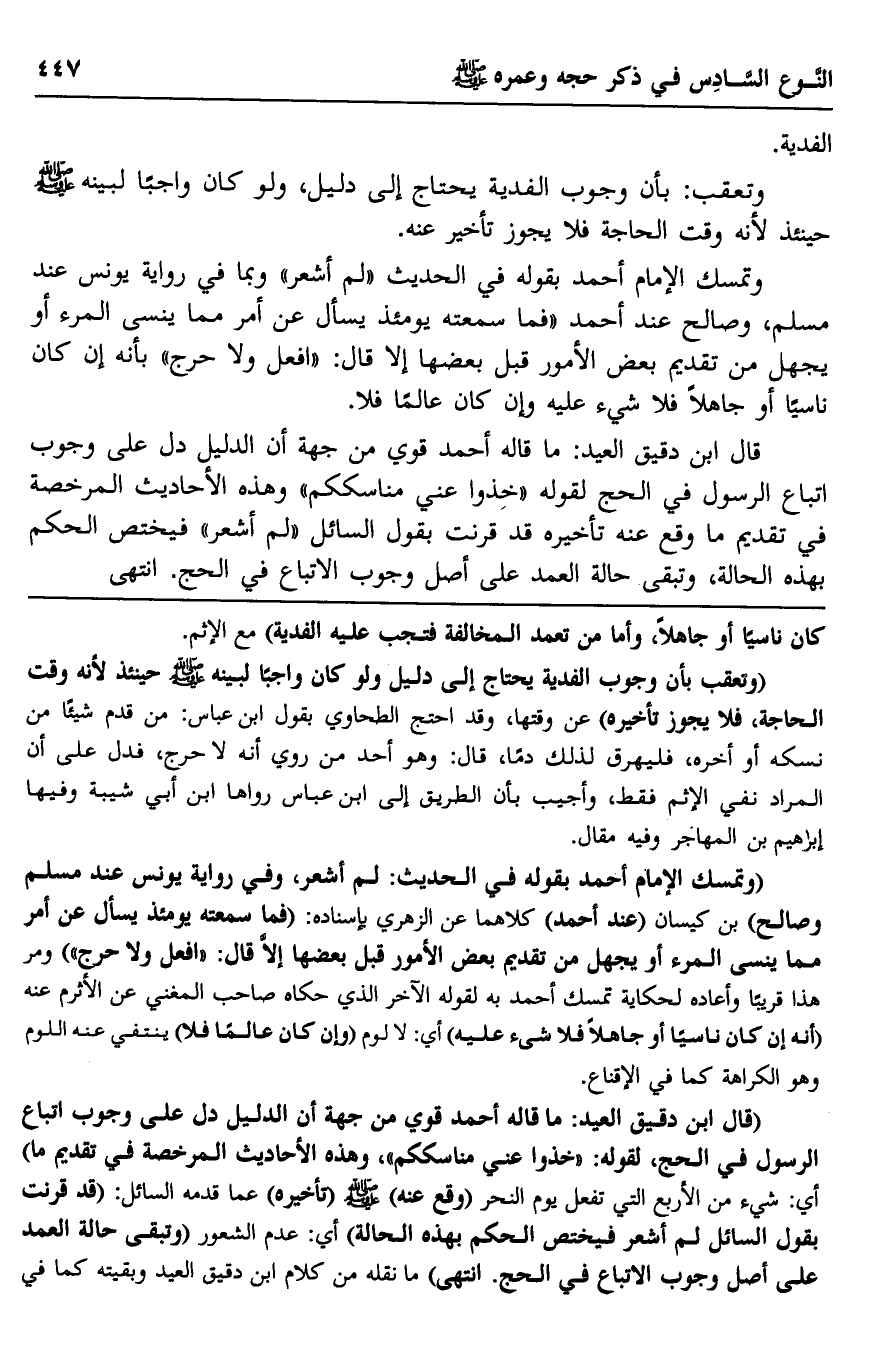 وتمسك الإمام أحمد بقوله في الحديث: "لم أشعر" وبما في رواية يونس عند مسلم، وصالح عند أحمد: "فما سمعته يومئذ يساله عن أمر مما ينسى المرء أو يجهل من تقدم بعض الأمور قبل بعضها إلا قال: "افعل ولا حرج" بأنه إن كان ناسيا أو جاهلا فلا شيء عليه وإن كان عالمًا فلا.
