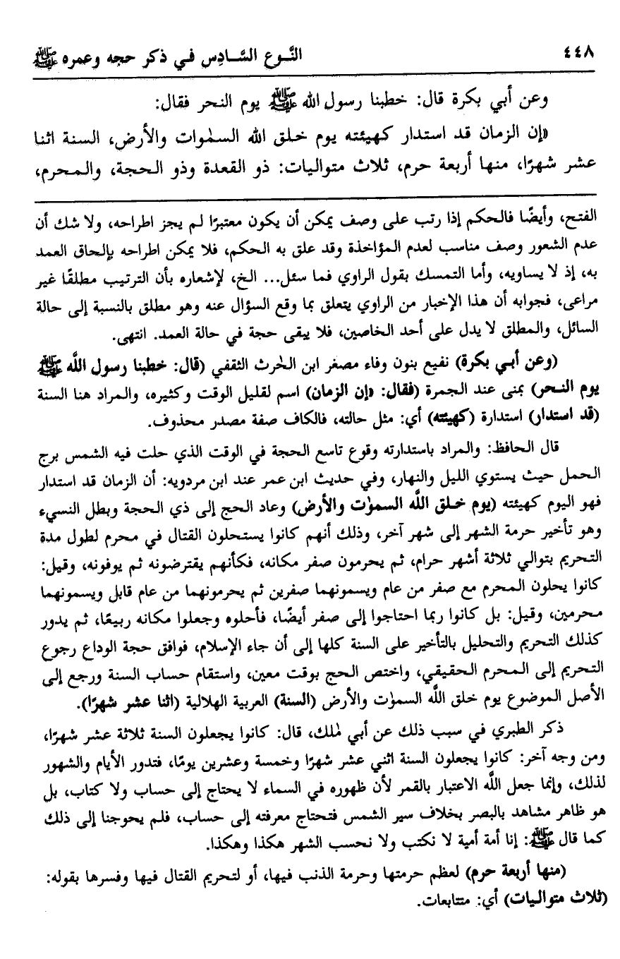 وعن أبي بكرة قال: خطبنا رسول الله -صلى الله عليه وسلم- يوم النحر فقال: "إن الزمان قد استدار كهيئته يوم خلق الله السماوات والأرض، السنة اثنا عشر شهرا، منها أربعة حرم، ثلاث متواليات: ذو القعدة وذو الحجة، والمحرم،