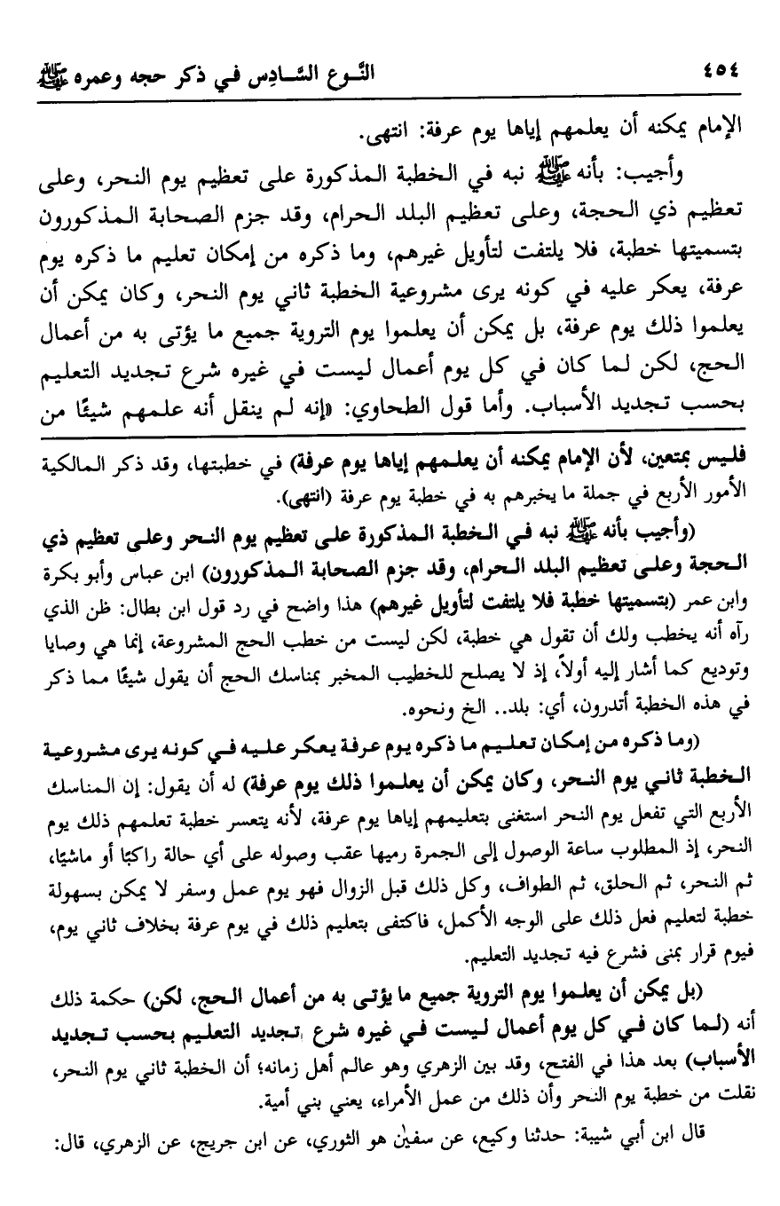 "بل يمكن أن يعلموا يوم التروية جميع ما يؤتى به من أعمال الحج، لكن" حكمة ذلك أنه "لما كان في كل يوم أعمال ليست في غيره شرع تجديد التعليم بحسب تجديد الأسباب" بعد هذا في الفتح، وقد بين الزهري وهو عالم أهل زمانه؛ أن الخطبة ثاني يوم النحر، نقلت من خطبة يوم النحر وأن ذلك من عمل الأمراء، يعني بني أمية.