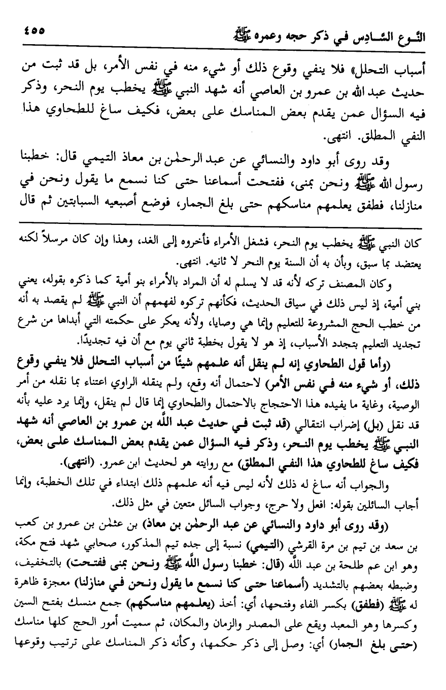 "وأما قول الطحاوي إنه لم ينقل أنه علمهم شيئا من أسباب التحلل فلا ينفي وقوع ذلك، أو شيء منه في نفس الأمر" لاحتمال أنه وقع، ولم ينقله الراوي اعتناء بما نقله من أمر الوصية، وغاية ما يفيده هذا الاحتجاج بالاحتمال والطحاوي إنما قال لم ينقل، وإنما يرد عليه بأنه قد نقل "بل" إضراب انتقالي "قد ثبت في حديث عبد الله بن عمرو بن العاصي أنه شهد النبي -صلى الله عليه وسلم- يخطب يوم النحر، وذكر فيه السؤال عمن يقدم بعض المناسك على بعض، فكيف ساغ للطحاوي هذا النفي المطلق" مع روايته لحديث ابن عمرو. "انتهى".