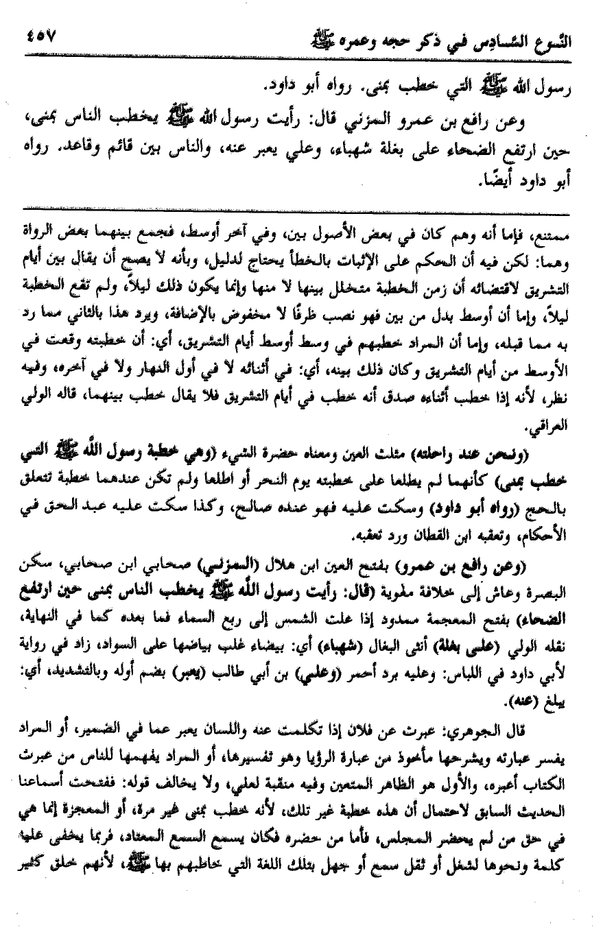 وعن رافع بن عمرو المزني قال: رأيت رسول الله -صلى الله عليه وسلم- يخطب الناس بمنى، حين ارتفع الضحاء على بغلة شهباء، وعلي يعبر عنه، والناس بين قائم وقاعد. رواه أبو داود أيضا.