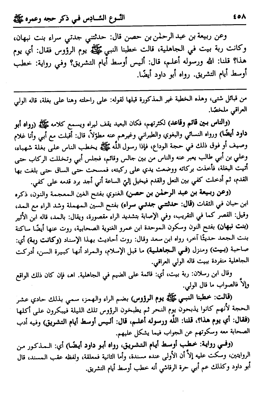 وعن ربيعة بن عبد الرحمن بن حصن قال: حدثتني جدتي سراء بنت نبهان، وكانت ربة بيت في الجاهلية، قالت: خطبنا النبي -صلى الله عليه وسلم- يوم الرءوس فقال: أي يوم هذا؟ قلنا: الله ورسوله أعلم، قال: "أليس أوسط أيام التشريق"؟ وفي رواية: خطب أوسط أيام التشريق. رواه أبو داود أيضا.