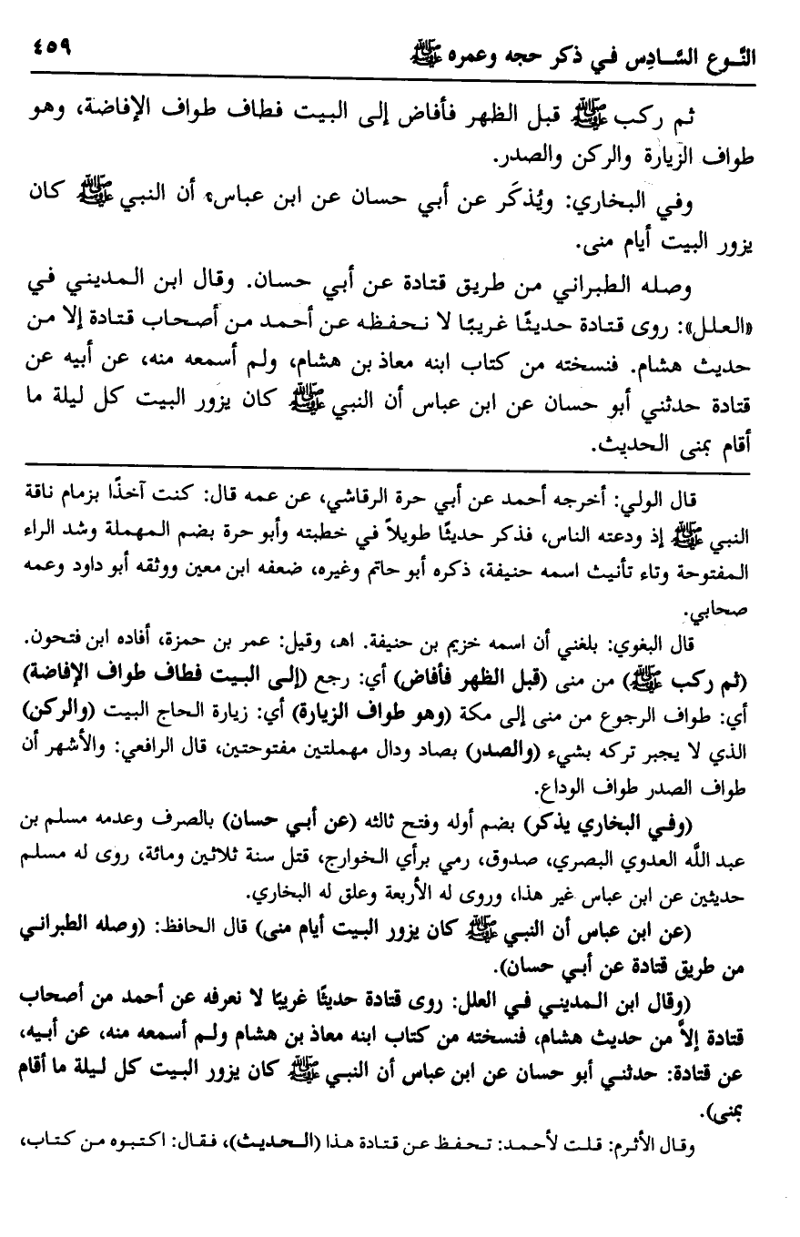 "وقال ابن المديني في العلل: روى قتادة حديثا غريبا لا نعرفه عن أحمد من أصحاب قتادة إلا من حديث هشام، فنسخته من كتاب ابنه معاذ بن هشام ولم أسمعه منه، عن أبيه، عن قتادة: حدثني أبو حسان عن ابن عباس أن النبي -صلى الله عليه وسلم- كان يزور البيت كل ليلة ما أقام بمنى".