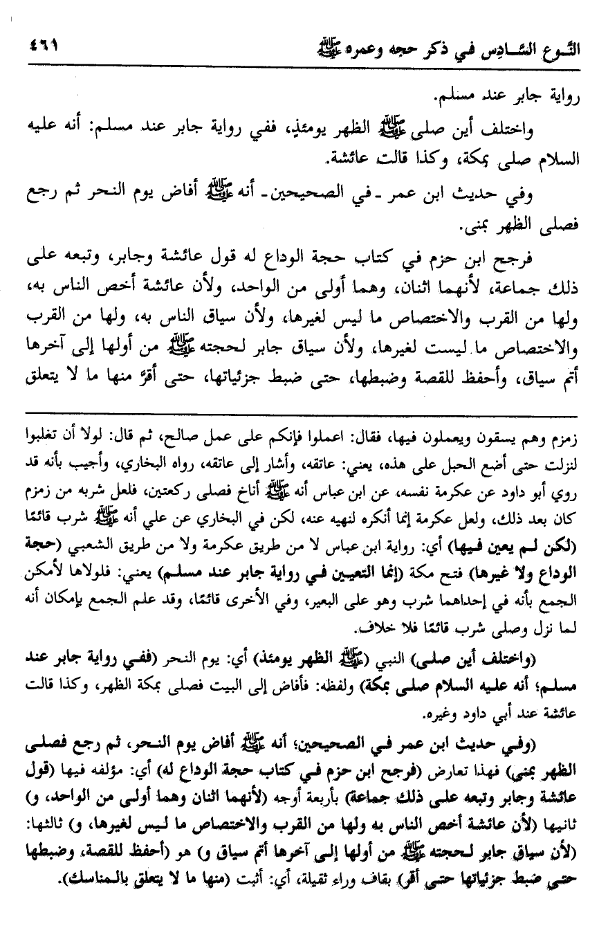 "وفي حديث ابن عمر في الصحيحين؛ أنه -صلى الله عليه وسلم- أفاض يوم النحر، ثم رجع فصلى الظهر بمنى" فهذا تعارض "فرجح ابن حزم في كتاب حجة الوداع له" أي: مؤلة فيها "قول عائشة وجابر وتبعه على ذلك جماعة" بأربعة أوجه "لأنهما اثنان وهما أولى من الواحد، و" ثانيها "لأن عائشة أخص الناس به ولها من القرب والاختصاص ما ليس لغيرها، و" ثالثها: "لأن سياق جابر لحجته -صلى الله عليه وسلم- من أولها إلى آخرها أتم سياق و" هو "أحفظ للقصة، وضبطها حتى ضبط جزئياتها حتى أقر" بقاف وراء ثقيلة، أي: أثبت "منها ما لا يتعلق بالمناسك".