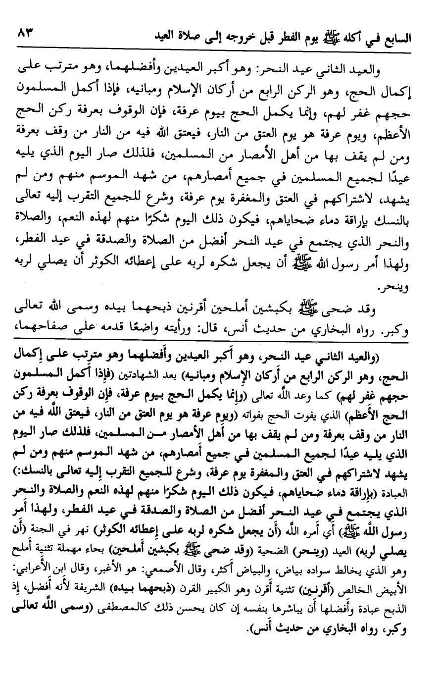 "والعيد الثاني عيد النحر، وهو أكبر العيدين وأفضلهما وهو مترتب على إكمال الحج، وهو الركن الرابع من أركان الإسلام ومبانيه" بعد الشهادتين "فإذا أكمل المسلمون حجهم غفر لهم" كما وعد الله تعالى "وإنما يكمل الحج بيوم عرفة، فإن الوقوف بعرفة ركن الحج الأعظم" الذي يفوت الحج بفواته "ويوم عرفة هو يوم العتق من النار، فيعتق الله فيه من النار من وقف بعرفة ومن لم يقف بها من أهل المسلمين، فلذلك صار اليوم الذي يليه عيدا لجميع المسلمين في جميع أمصارهم، من شهد الموسم منهم ومن لم يشهد لاشتراكهم في العتق والمغفرة يوم عرفة، وشرع للجميع التقرب إليه تعالى بالنسك:" العبادة "بإراقة دماء ضحاياهم، فيكون ذلك اليوم شكرا منهم لهذه النعم والصلاة والنحر الذي يجتمع في عيد النحر أفضل من الصلاة والصدقة في عيد الفطر، ولهذا أمر رسول الله -صلى الله عليه وسلم" أي أمره الله "أن يجعل شكره لربه على إعطائه الكوثر" نهر في الجنة "أن يصلي لربه" العيد "وينحر" الضحية "وقد ضحى -صلى الله عليه وسلم- بكبشين أملحين" بحاء مهملة تثنية أملح وهو الذي يخالط سواده بياض، والبياض أكثر، وقال الأصمعي: هو الأغبر، وقال ابن الأعرابي: الأبيض الخالص "أقرنين" تثنية أقرن وهو الكبير القرن "ذبحهما بيده الشريفة؛ لأنه أفضل، إذ الذبح عبادة وأفضلها أن يباشرها بنفسه إن كان يحسن ذلك كالمصطفى "وسمى الله تعالى وكبر، رواه البخاري من حديث أنس".