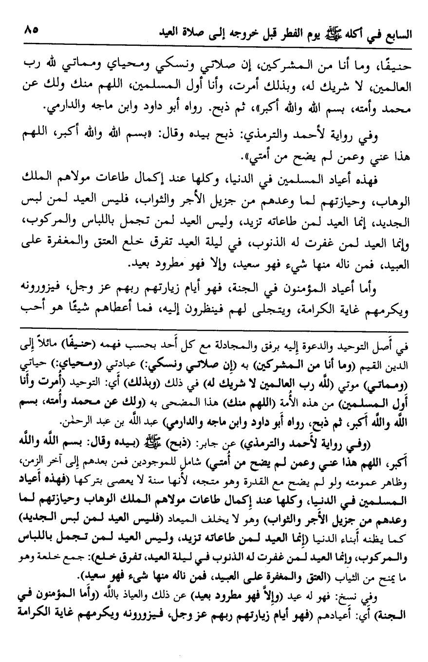 "حنيفا، وما أنا من المشركن، إن صلاتي ونسكي ومحياي ومماتي لله رب العالمين، لا شريك له، وبذلك أمرت، وأنا أول المسلمين، اللهم منك ولك عن محمد وأمته، بسم الله والله أكبر"، ثم ذبح. رواه أبو داود وابن ماجه والدارمي.