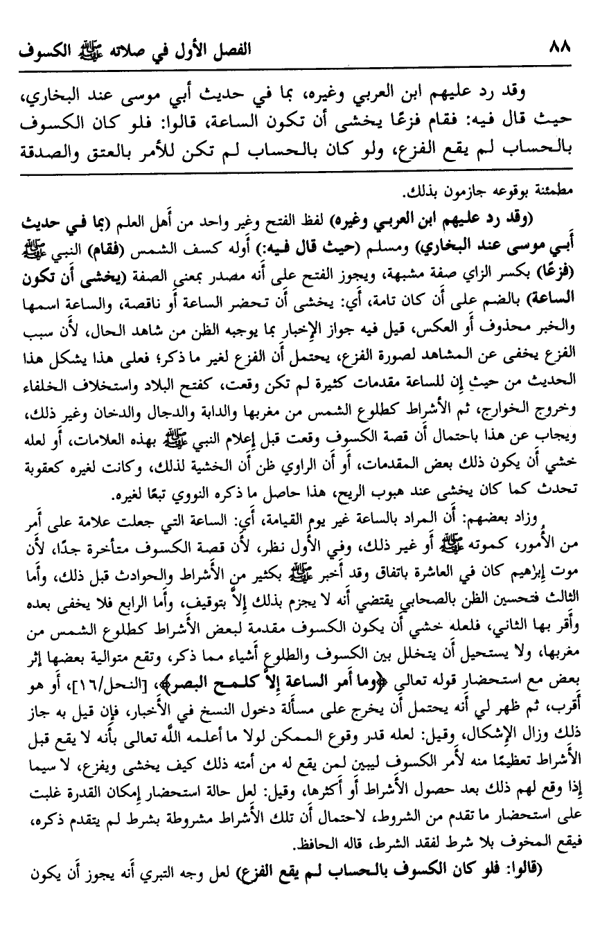 وزاد بعضهم: أن المراد بالساعة غير يوم القيامة، أي: الساعة التي جعلت علامة على أمر من الأمور، كموته -صلى الله عليه وسلم- أو غير ذلك، وفي الأول نظر؛ لأن قصة الكسوف متأخرة جدا؛ لأن موت إبراهيم كان في العاشرة باتفاق وقد أخبر -صلى الله عليه وسلم- بكثير من الأشراط والحوادث قبل ذلك، وأما الثالث فتحسين الظن بالصحابي يقتضي أنه لا يجزم بذلك إلا بتوقيف، وأما الرابع فلا يخفى بعده وأقر بها الثاني، فلعله خشي أن يكون الكسوف مقدمة لبعض الأشراط كطلوع الشمس من مغربها، ولا يستحيل أن يتخلل بين الكسوف مقدمة لبعض الأشراط كطلوع الشمس من مغربها، ولا يستحيل أن يتخلل بين الكسوف والطلوع أشياء مما ذكر، وتقع متوالية بعضها إثر بعض مع استحضار قوله تعالى: {وَمَا أَمْرُ السَّاعَةِ إِلَّا كَلَمْحِ الْبَصَرِ} [النحل: 16] ، أو هو أقرب، ثم ظهر لي أنه يحتمل أن يخرج على مسألة دخول النسخ في الأخبار، فإن قيل به جاز ذلك وزال الإشكال، وقيل: لعله قدر وقوع الممكن لولا ما أعلمه الله تعالى بأنه لا يقع قبل الأشراط تعظيما منه لأمر الكسوف ليبين لمن يقع له من أمته ذلك كيف يخشى ويفزع، لا سيما إذا وقع لهم ذلك بعد حصول الأشراط أو أكثرها، وقيل: لعل حالة استحضار إمكان القدرة غلبت على استحضار ما تقدم من الشروط، لاحتمال أن تلك الأشراط مشروطة بشرط لم يتقدم ذكره، فيقع المخوف بلا شرط لفقد الشرط، قاله الحافظ.