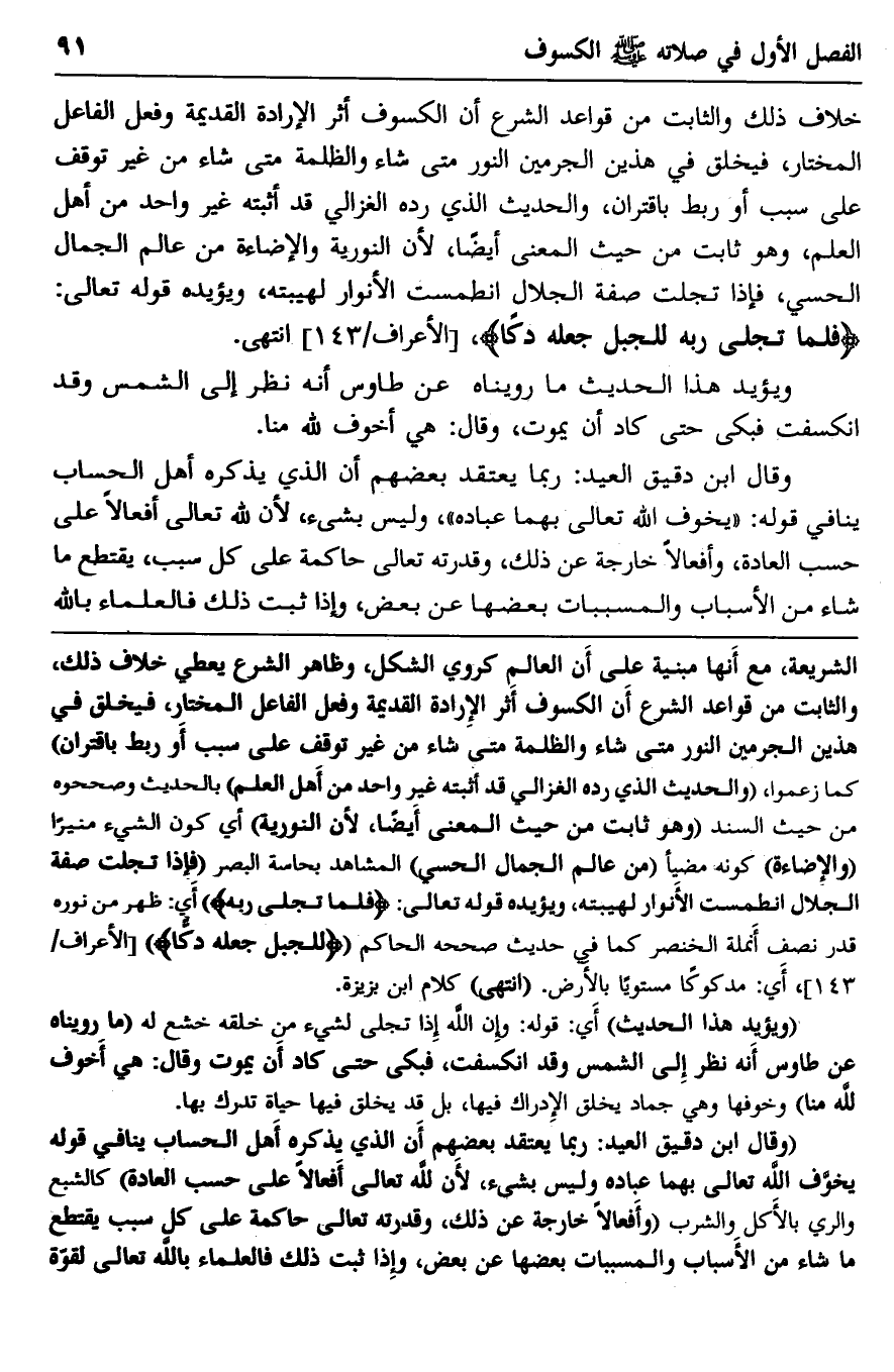 خلاف ذلك والثابت من قواعد الشرع أن الكسوف أثر الإرادة القديمة وفعل الفاعل المختار، فيخلق في هذين الجرمين النور متى شاء، والظلمة متى شاء من غير توقف على سبب أو ربط باقتران، والحديث الذي رده الغزالي قد أثبته غير واحد من أهل العلم، وهو ثابت من حيث المعنى أيضا؛ لأن النورية والإضاءة من عالم الجمال الحسي، فإذا تجلت صفة الجلال انطمست الأنوار لهيبته، ويؤيده قوله تعالى: {فَلَمَّا تَجَلَّى رَبُّهُ لِلْجَبَلِ جَعَلَهُ دَكًّا} [الأعراف: 143] . انتهى.
