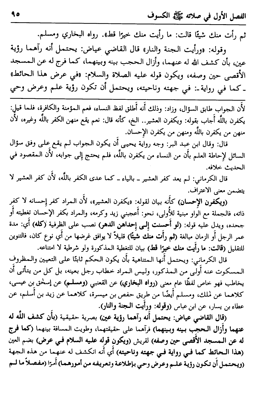 قال الكرماني: ويحتمل أنها المتناهية بأن يكون الحكم ثابتا على التعيين والمظروف المسكوت عنه أولى من المذكور، وليس المراد خطاب رجل بعينه، بل كل من يتأتي أن يخاطب فهو خاص لفظا عام معنى "رواه البخاري" عن القعنبي "ومسلم" عن إسحاق بن عيسى، كلاهما عن مالك، ومسلم أيضا من طريق حفص بن ميسرة، كلاهما عن زيد بن أسلم، عن عطاء بن يسار، عن ابن عباس "وقوله: "ورأيت الجنة والنار".