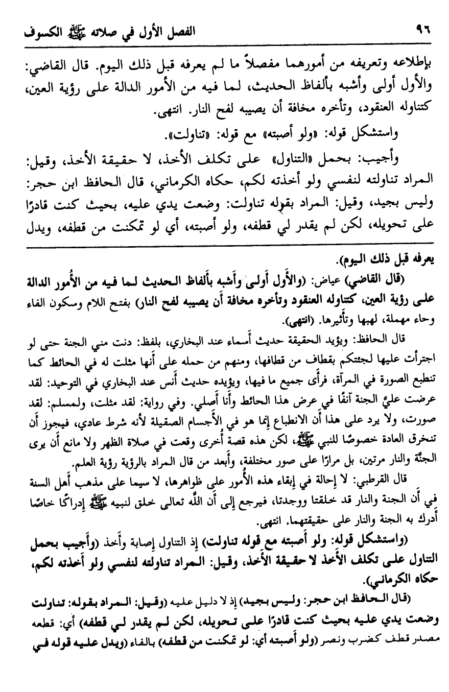 "قال القاضي" عياض: "والأول أولى وأشبه بألفاظ الحديث لما فيه من الأمور الدالة على رؤية العين، كتناوله العنقود وتأخره مخافة أن يصيبه لفح النار" بفتح الالم وسكون الفاء وحاء مهملة، لهبها وتأثيرها. "انتهى".