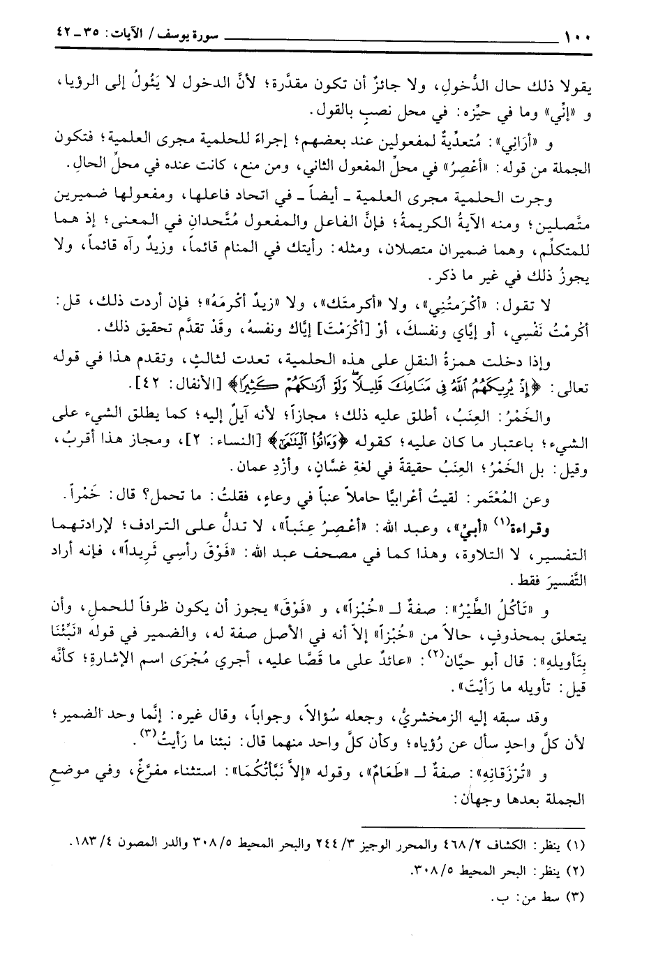 وقراءة «أبيَّ» ، وعبد الله: «أعْصِرُ عِنَباً» ، لا تدلُّ على الترادف؛ لإرداتهما؛ لإرادتهما التفسير، لا التلاوة، وهذا كما في مصحف عبد الله: «فَوْقَ رأسِي ثَرِيداً» ، فإنه اراد التَّفسيرَ فقط.