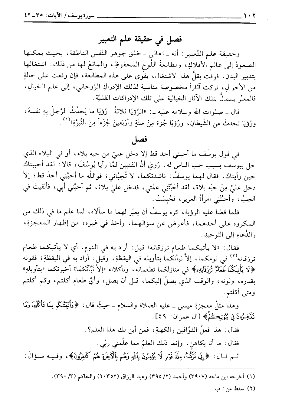 وحقيقة علم التَّعبير: أنه تعالى خلق جوهر النَّفس الناطقة، بحيث يمكنها الصعودُ إلى عالم الأفلاكِ، ومطالعةُ اللَّوحِ المحفوظِ، والمانعُ لها من ذلك: اشتغالها بتدبير البدنِ، فوقت يقلُّ هذا الاشتغال، يقوى على هذه المطالعة، فإن وقعت على حالةٍ من الأحوال، ترك آثاراً مخصوصة مناسبة لذلك الإدراكِ الرَّوحاني، إلى علم الخيال، فالمعبِّر يستدلُّ بتلك الآثار الخيالية على تلك الإدراكات القلبيَّة.