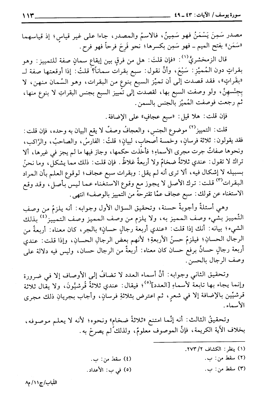 فإن قلت: ذلك مما يشكل، وما نحنُ بسبيله لا إشكال فيه، ألا ترى أنه لم يقل: وبقرات سبع عجاف؛ لوقوع العلم بأن المراد البقرات قلت: ترك الأصل لا يجوز مع وقوع الاستغناء عما ليس بأصل، وقد وقع الاستغناء عن قولك: سبع عجاف عمَّا تقترحهُ من التمييز بالوصف «انتهى.