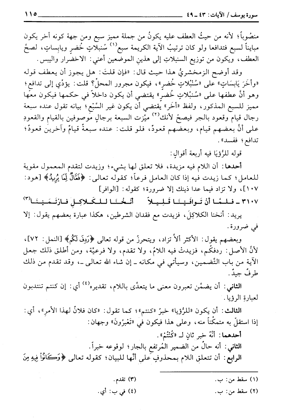 وقد أوضح الزمخشريُّ هذا حيث قال: «فإن قلتَ: هل يجوز أن يعطف قوله» وأخَرَ يَابسَاتٍ «على» سُنْبُلاتٍ خُضرٍ «، فيكون مجرور المحلِّ؟ قلت: يؤدِّي إلى تدافع؛ وهو أنَّ عطفها على» سُنبُلاتٍ خُضرٍ «يقتضي أن يكون داخلاً في حكمها فيكون معها مميز السبع المذكور، ولفظ» أخَر «يقتضي أن يكون غير السَّبْعِح بيانه تقول عنده سبعة رجال قيام وقعود بالجر فيصحّ لأنك ميَّزت السبعة برجالٍ موصوفين بالقيام والقعودِ على أنَّ بعضهم قيام، وبعضهم قعودٌ، فلو قلت: عنده سبعةٌ قيامٌ وآخرين قعودٌ؛ تدافع؛ ففسد» .