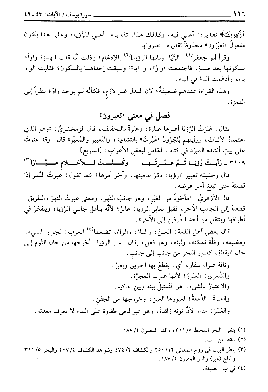 يقال: عَبَرْتُ الرُّؤيَا أعبرها عبارة، وعبَرةً بالتخفيف، قال الزمخشريُّ: «وهو الذي اعتمدهُ الأثباتُ، ورأيتهم يُنْكِرُونَ» عَبَّرتُ «بالتشديد، والتَّعبير والمُعبِّر» قال: وقد عثرتُ على بيتٍ أشده المبرِّد في كتاب الكاملِ لبعضِ الأعرابِ: [السريع]