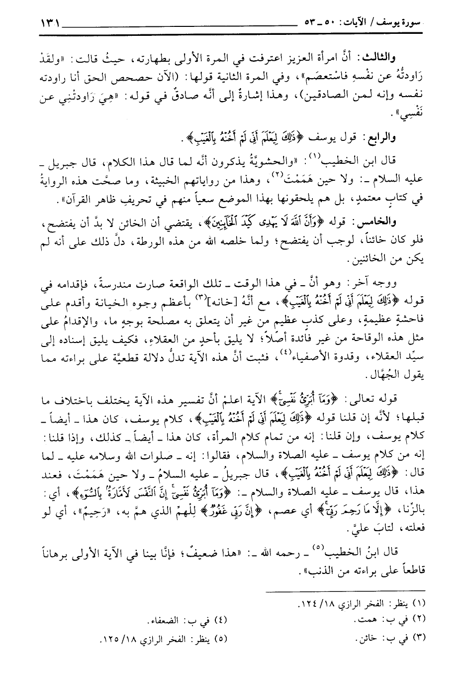 ووجه آخر: وهو أنَّ ت في هذا الوقت تلك الواقعة صارت مندرسةً، فإقدامه في قوله {ذلك لِيَعْلَمَ أَنِّي لَمْ أَخُنْهُ بالغيب} ، مع أنَّهُ [خانه] بأعظم وجوه الخيانة وأقدم على فاحشةٍ عظيمةٍ، وعلى كذبٍ عظيمٍ من غير أن يتعلق به مصلحة بوجهٍ ما، والإقدامُ على مثل هذه الوقاحة من غير فائدة أصلاًح لا يليق بأحدٍ من العقلاءِ، فكيف يليق إسناده إلى سيِّد العقلاء، وقدوة الأصفياء، فثبت أنَّ هذه الآية تدلُّ دلالة قطعيَّة على براءته مما يقول الجُهَّال.
