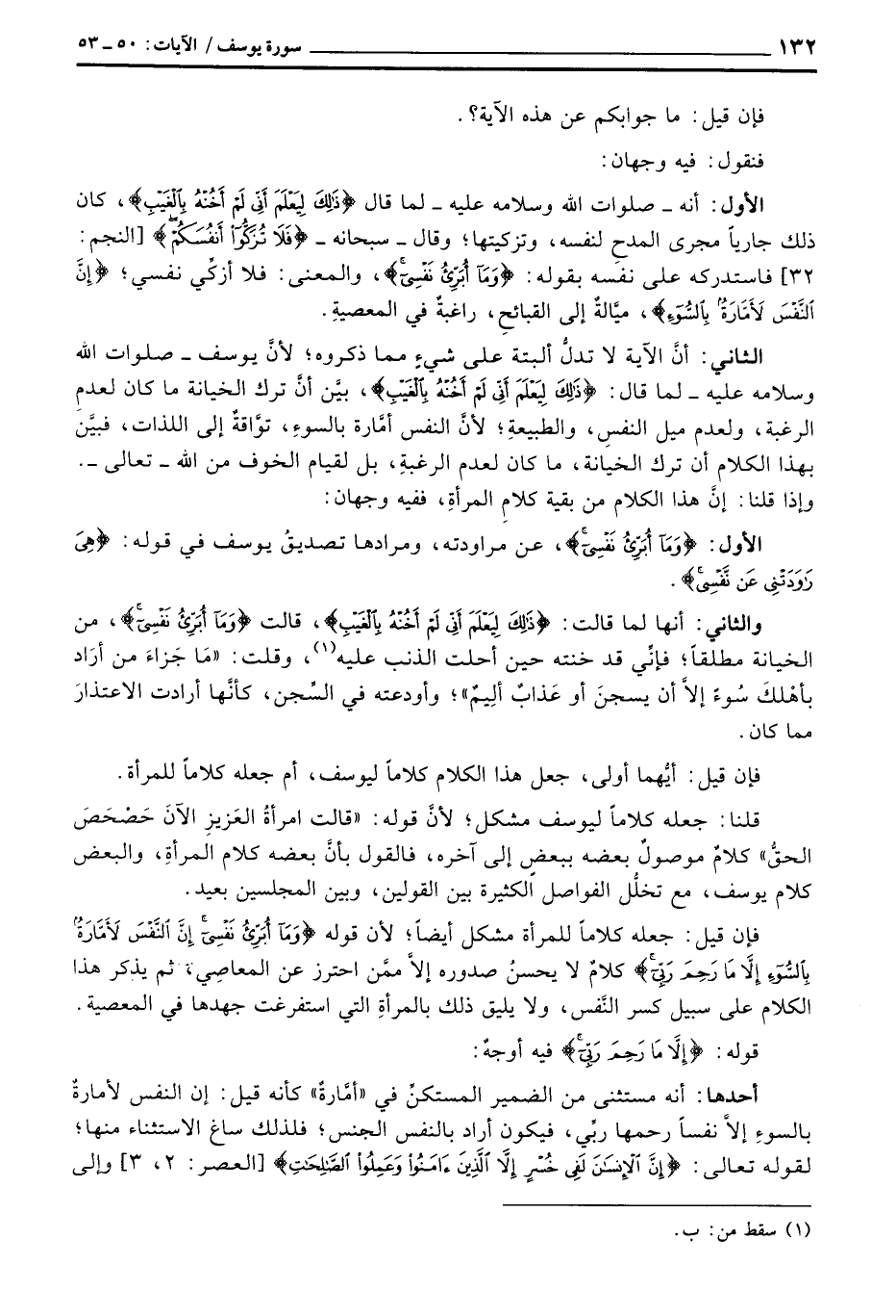 قلنا: جعله كلاماً ليوسف مشكل؛ لأنَّ قوله: «قالت امرأة العَزيزِ الآن حَصْحَصَ الحقٌّ» كلامٌ موصولٌ بغضه ببعضٍ إلى آخره، فالقول بأنَّ بعضه كلام المرأةِ، والبعض كلام يوسف، تخلُّل الفواصل الكثيرة بين القولين، وبين المجلسين بعيد.