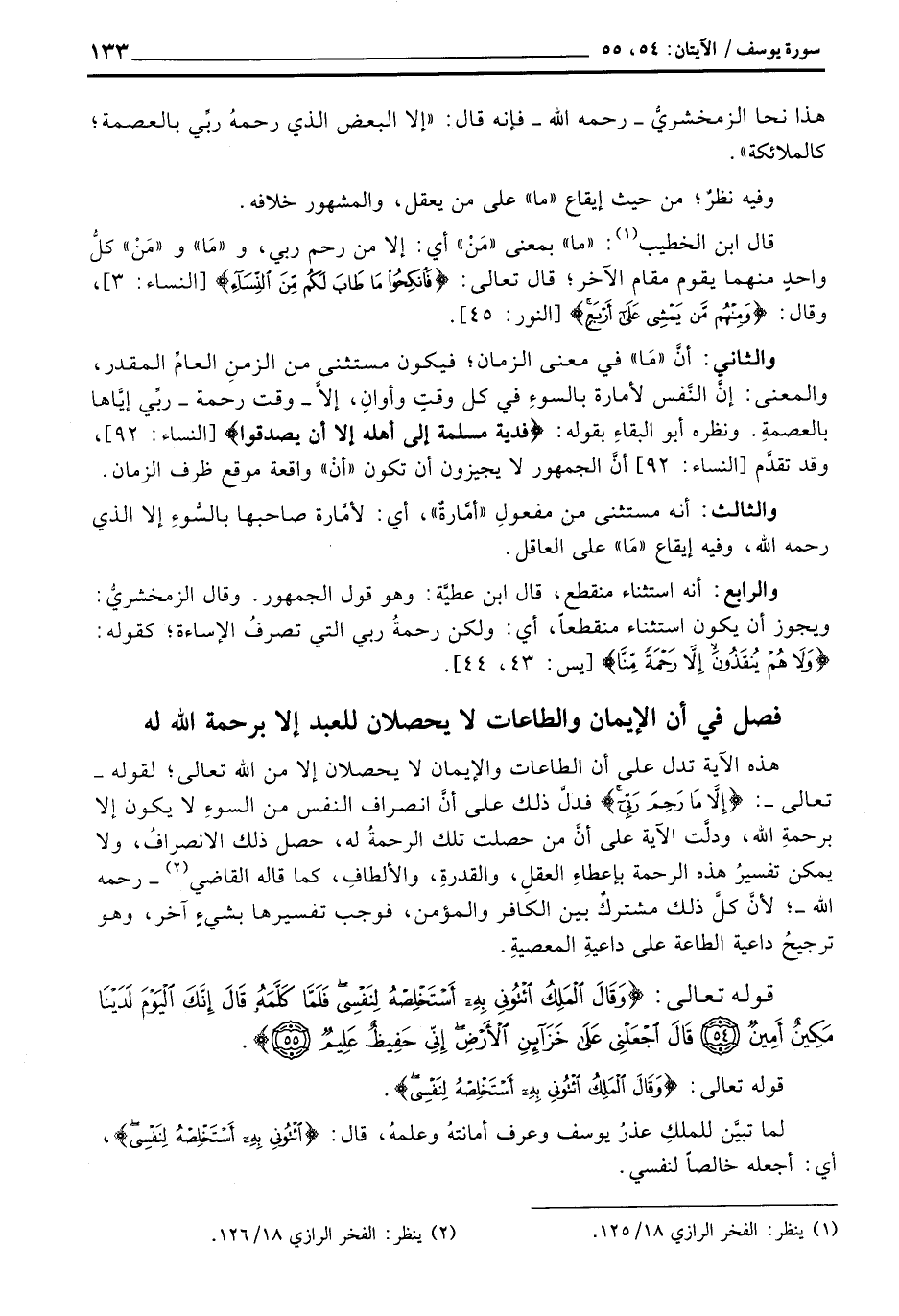هذه الآية تدل على أن الطاعات والإيمان لا يحصلان إلا من الله تعالى؛ لقوله تعالى: {إِلاَّ مَا رَحِمَ ربي} فدلَّ ذلك على إنَّ انصراف النفس من السوءِ لا يكون إلا برحمة الله، ودلَّت الآية على أنَّ من حصلت تلك الحرمةُ له، حصل ذلك الانصرافُ، ولا يمكن تفسيرُ هذه الرحمة بإعطاءِ العقل، والقدرةِ، والألطافِ، كما قاله القاضي رَحِمَهُ اللَّهُ؛ لأنَّ كلَّ ذلك مشتركٌ بين الكافر والمؤمن، فوجب تفسيرها بشيءٍ آخر، وهو ترجيحُ داعية الطاعة على داعيةِ المعصيةِ.