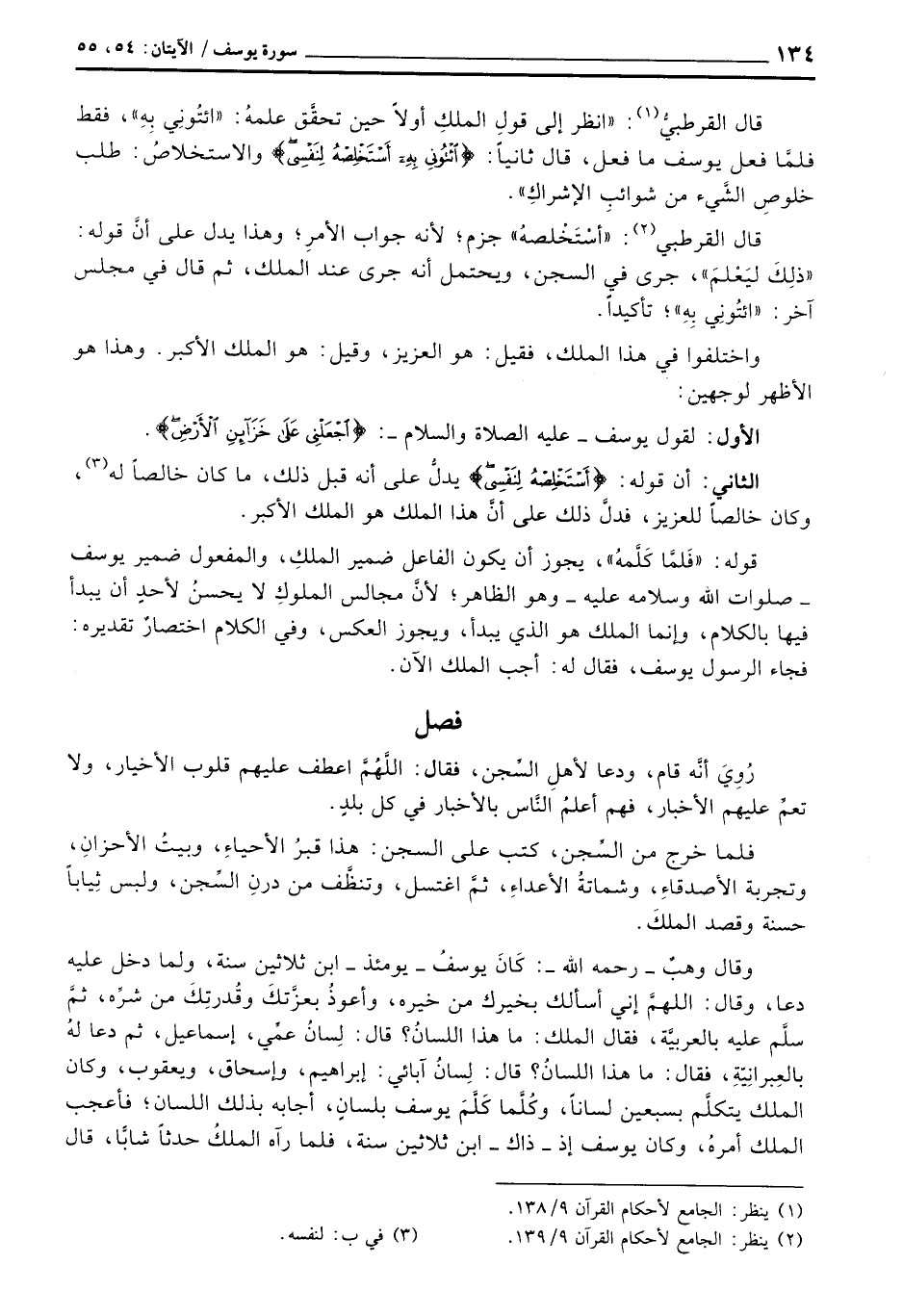 قال القرطبيُّ: «انظر إلى قول الملكِ أولاً حين تحقَّق علمهُ:» ائتُونِي بِهِ «، فقط فلمَّا فعل يوسف ما مفعل، قال ثانياً {ائتوني بِهِ أَسْتَخْلِصْهُ لِنَفْسِي} والاستخلاصُ: طلب خلوصِ الشَّيء من شوائبِ الإشراكِ» .