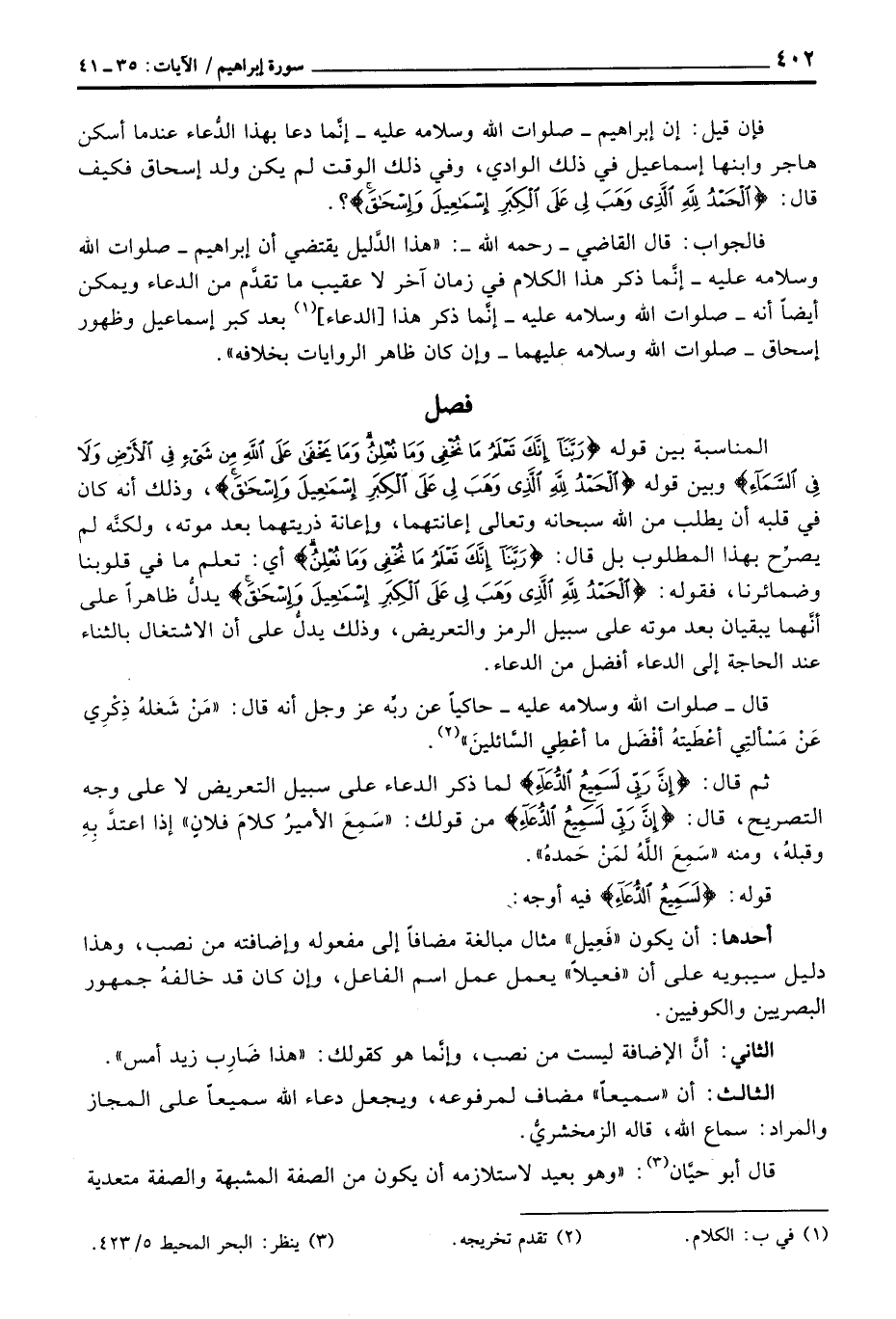 فالجواب: قال القاضي رَحِمَهُ اللَّهُ: «هذا الدَّليل يقتضي أن إبراهيم صلوات الله وسلامه عليه، إنَّما ذكر هذا الكلام في زمان آخر لا عقيب ما تقدَّم من الدعاء ويمكن إيضاً أنه صلوت الله وسلامه عليه إنَّما ذكر هذا [الدعاء] بعد كبر إسماعيل وظهرو إسحاق صلوات الله وسلامه عليهما وإن كان ظاهر الروايات بخلافه» .