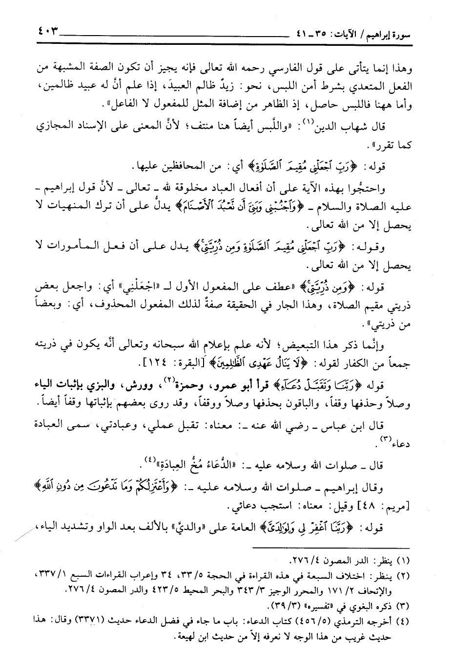 قوله: {وَمِن ذُرِّيَتِي} «عطف على المفعول الأول ل» اجْعَلْنِي «أي: واجعل بعض ذريتي مقيم الصلاة، وهذا الجار في الحقيقة صفةٌ لذلك المفعول المحذوف، أي: وبعضاً من ذريتي» .