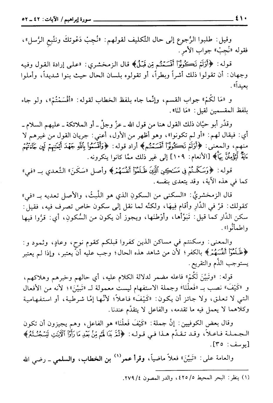 قوله: «وتَبيَّنَ لَكُمْ» فاعله مضمر لدلالة الكلام عليه، أي حالهم وخبرهم وهلاكهم، و «كَيْفَ» نصب ب «فَعلْنَا» وحملة الاستفهام ليست معمولة ل «تَبيَّنَ؛ لأنه من الأفعال التي لا تعلق، ولا جائز أن يكون:» كَيْفَ «فاعلاً؛ لأنَّها إمَّا شرطية، أو استفهامية وكلاهما لايعمل فيه ما تقدمه، والفاعل لا يتقدَّم عندنا.