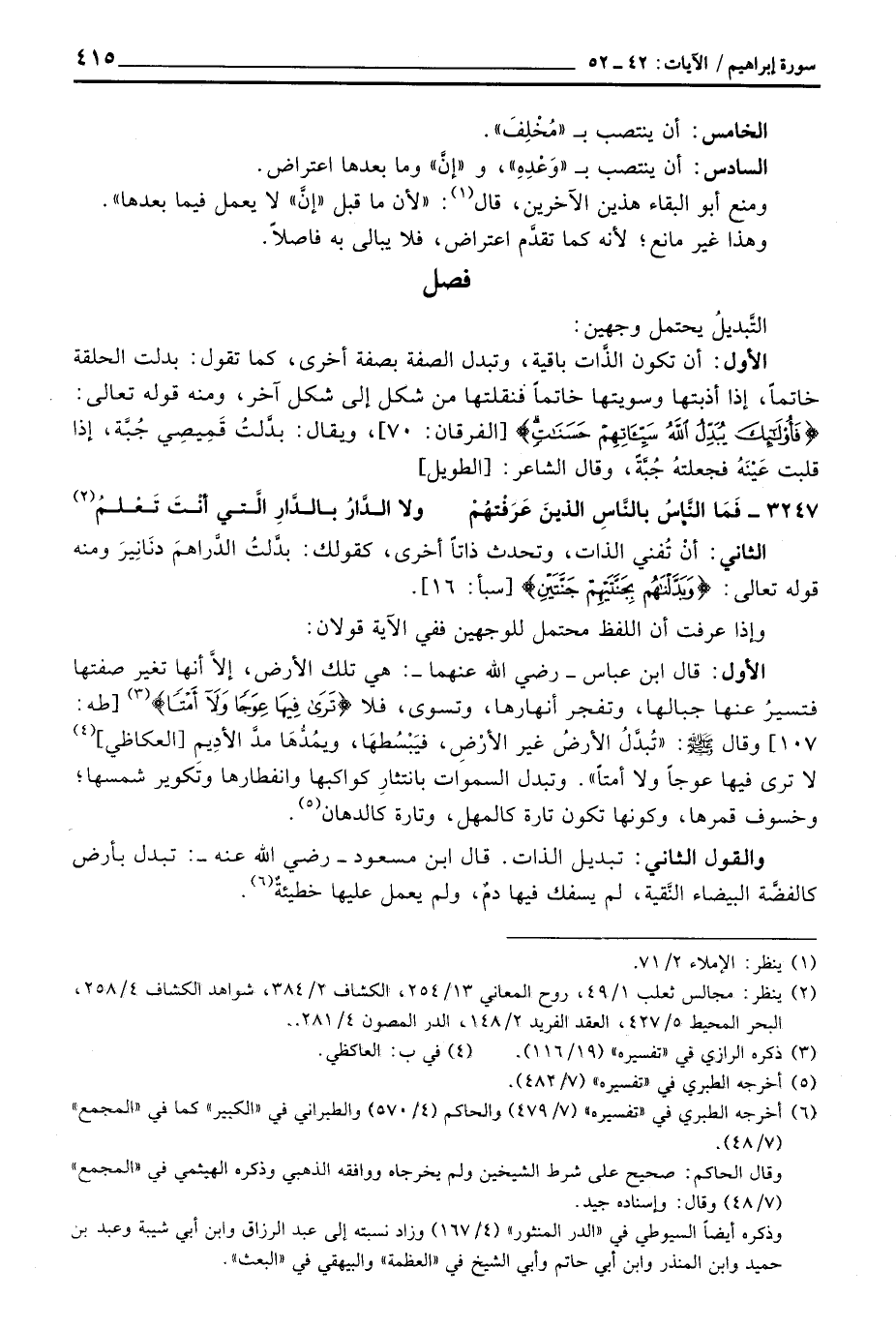 الأول: قال ابن عباس رَضِيَ اللَّهُ عَنْهما: هي تلك الأرض، إلاَّ أنها تغير صفتها فتسيرُ عنها جبالها، وتفجر أنهارها، وتسوى، فلا {ترى فِيهَا عِوَجاً ولاا أَمْتاً} [طه: 107] وقال صَلَّى اللَّهُ عَلَيْهِ وَسَلَّم َ:» تُبدَّلُ الأرضُ غيكر الأرْضِ، فيَبْسُطهَا، ويمُدُهَا مدَّ الأدِيم [العكاظي] لا ترى فيها عوجاً ولا أمتاً «وتبدل السموات باتثارِ كواكبها وانفطارها وتكوير شمسها؛ وخسوف قمرها، وكونها تكن تارة كالمهل، وتارة كالدهان.