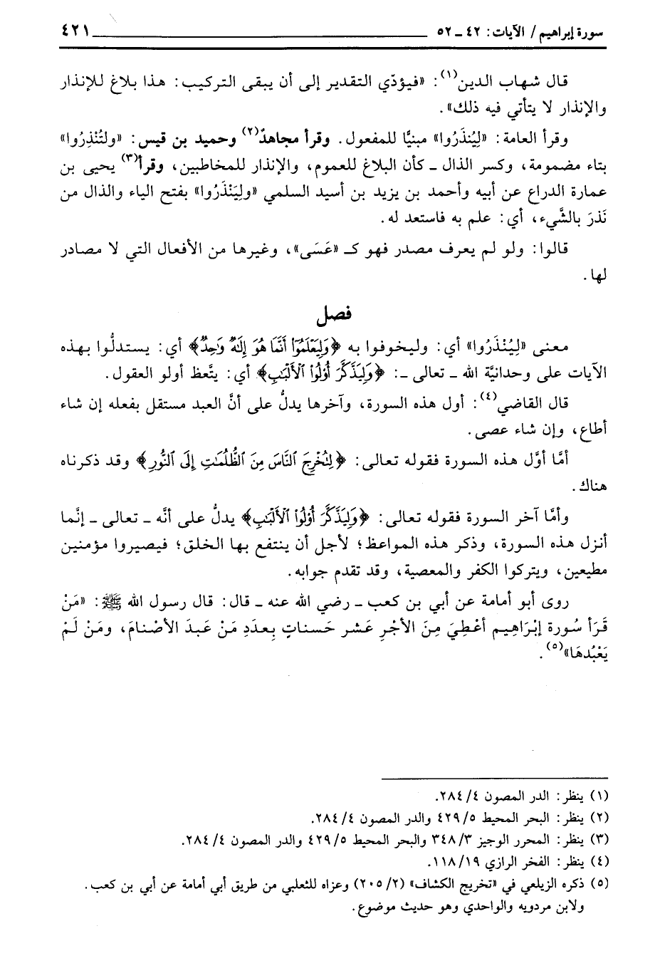 قال شهاب الدين: «فيؤدّي التقدير إلى أن يبقى التركيب: هذا بلاغ للإنذار والإنذار لا يتأتي فيه ذلك» .