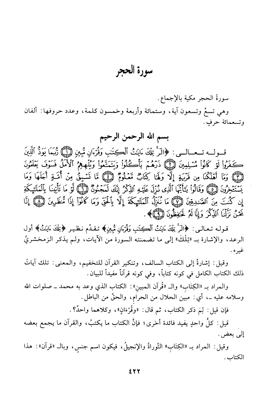 سورة الحجر مكية بالإجماع. وهي تسع وتسعون آية، وستمائة وأربعة وخمسون كلمة، وعدد حروفها: ألفان وتسعمائة حرف. بسم الله الرحمن الرحيم قوله تعالى: {ال ? رَ تِلْكَ آيَاتُ الْكِتَابِ وَقُرْآنٍ مُّبِينٍ} تقدَّم نظير {تِلْكَ آيَاتُ} أول الرعد، والإشارة ب «تِلْكَ» إلى ما تظمنته السورة من الآيات، ولم يذكر الزمشخريُّ غيره.