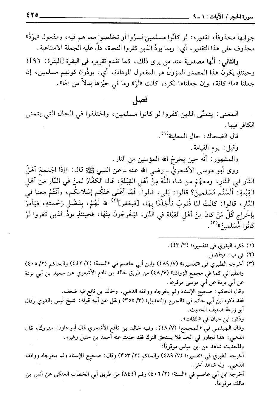روى أبو موسى الأشعريُّ رَضِيَ اللَّهُ عَنْه عن النبي صَلَّى اللَّهُ عَلَيْهِ وَسَلَّم َ قال: «إذَا اجْتمعَ أهْلُ النَّار في النَّارِ، ومعهُمْ من شَاءَ اللهُ مِنْ أهْلِ القِبْلةِ، قال الكفَّارُ لمِنْ في النَّار من أهْلِ القِبْلةِ: ألَسْتُم مُسْلمينَ؟ قالوا: بَلى، قالوا: فَمَا أغْنَى عَنْكُم إسْلامكُم، وأنْتُمْ معنا في النَّارِ، قالوا: كَانَتْ لنَا ذُنوبٌ فأُخِذْنَا بِهَا، [فيغفر] الله لَهُمْ، بِفضْلِ رَحْمتهِ، فيَأمرُ بإخْراجِ كُلِّ مَنْ كانَ مِنْ أهْلِ القِبْلةِ في النَّار، فيَخْرجُونَ مِنْهَا، فحنيئذٍ يودُّ الذين كفروا لَوْ كَانُوا مُسْلمينَ» .