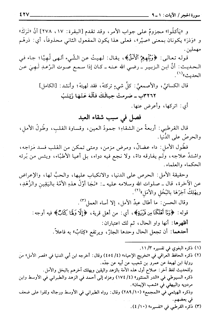 وحقيقة الأمل: الحرص على الدنيا، والانكباب عليها، والحبُّ لها، والإعراض عن الآخرة، قال صلوات الله وسلامه عليه:» نَجَا أوَّلُ هذهِ الأمَّة باليَقِينِ والزُّهْدِ، ويهْلِكُ آخِرُهَا بالبُخْلِ والأمَلِ «.