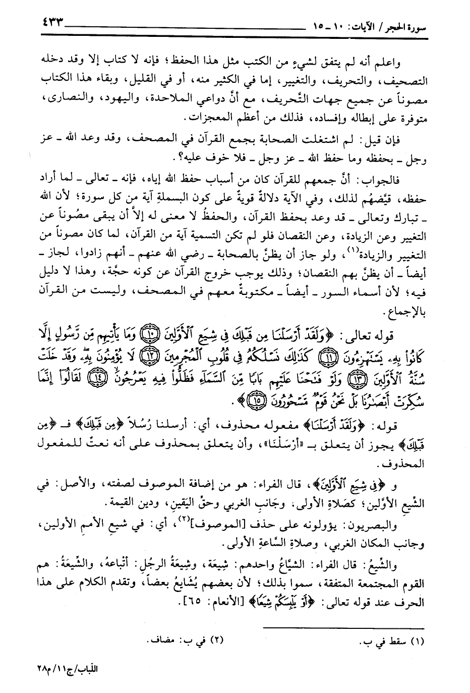 و {فِي شِيَعِ الأولين} ، قال الفراء: هو من إضافة المصوف لصفته، والأصل: في الشِّيعِ الأوَّلين؛ كصَلاةِ الأولى، وجَانبِ الغربي حقِّ اليَقينِ، وجين القيمة.