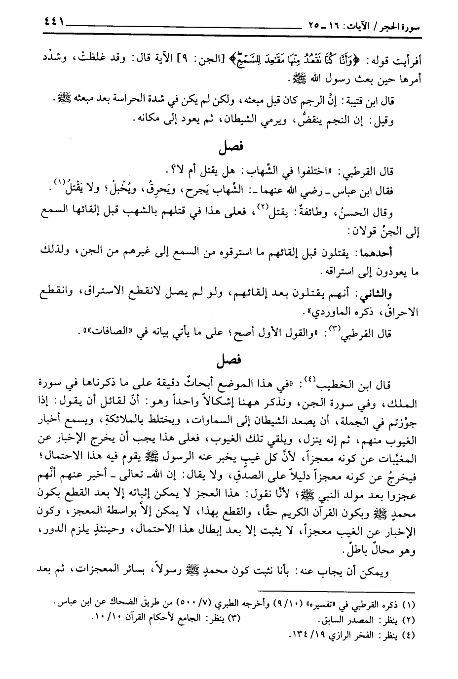 قال ابن الخطيب: «في هذا الموضع أبحاثٌ دقيقة على ما ذكرناها في سورة الملك، وفي سورة الجن، ونذكر ههنا إشكالاً واحداً وهو: أنّ لقائل أن يقول: إذا جوَّزتم في الجملة، أن يصعد الشيطان إلى السماوات، ويختلط بالملائكةِ، ويسمع أخبار الغيوب منهم، ثم إنه ينزل، ويلقي تلك الغيوب، فعلى هذا يجب أن يخرج الإخبار عن المغيَّبات عن كونه معجزاً، لأنَّ كل غيبٍ يخبر عنه الرسول صَلَّى اللَّهُ عَلَيْهِ وَسَلَّم َ يقوم فيه هذا الاحتمال؛ فيخرجُ عن كونه معجزاً دليلاً عل الصدقِ، ولا يقال: إن الله تعالى أخبر عنهم أنَّهم عجزوا بعد مولد النبي صَلَّى اللَّهُ عَلَيْهِ وَسَلَّم َ؛ لأنَّا نقول: هذا العجز لا يمكن إثباته إلا بعد القطع بكون محمدٍ صَلَّى اللَّهُ عَلَيْهِ وَسَلَّم َ وبكون القرآن الكريم حقًّا، والقطع بهذا، لا يمكن إلاَّ بواسطة المعجز، وكون الإخبار عن الغيب معجزاً، ولا يثبت إلا بعد إبطال هذا الاحتمال، وحينئذٍ يلزم الدور، وهو محالٌ باطلٌ.