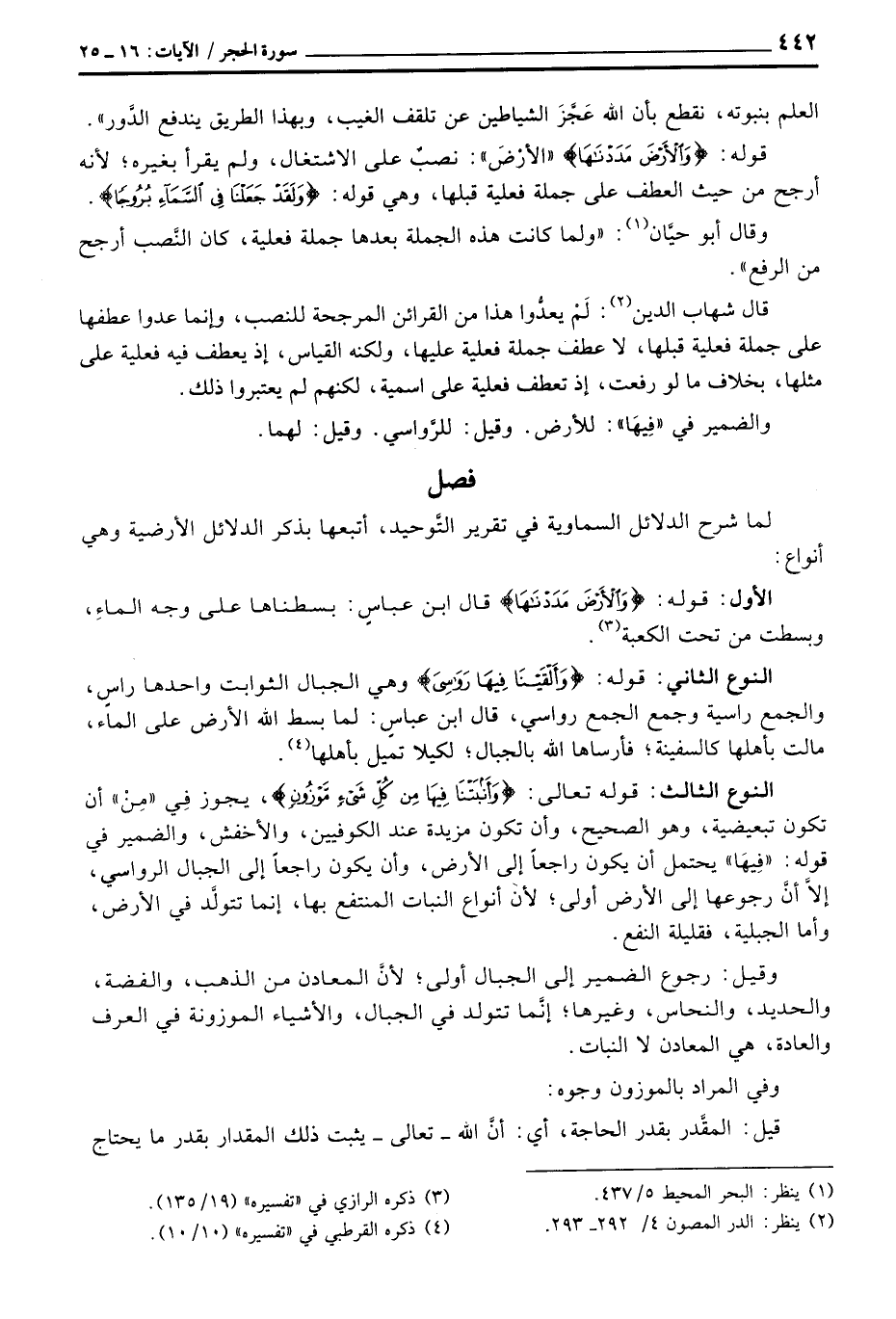 النوع الثالث: قوله تعالى: {وَأَنْبَتْنَا فِيهَا مِن كُلِّ شَيْءٍ مَّوْزُونٍ} ، يجوز فِي» مِنْ «أن تكمون تبعيضية، وهو الصحيح، وأن تكون مزيدة عند الكوفيين، والأخفش، والضمير في قوله:» فِيهَا «يحتمل أن يكون راجعاً إلى الأرض، وأن يكون راجعاً إلى الجبال الرواسي، إلاَّ أنَّ رجوعها إلى الأرض أولى؛ لأن أنواع النبات المنتفع بها، إنما تتولَّد في الأرض، وأما الجبلية، فقليلة النفع.