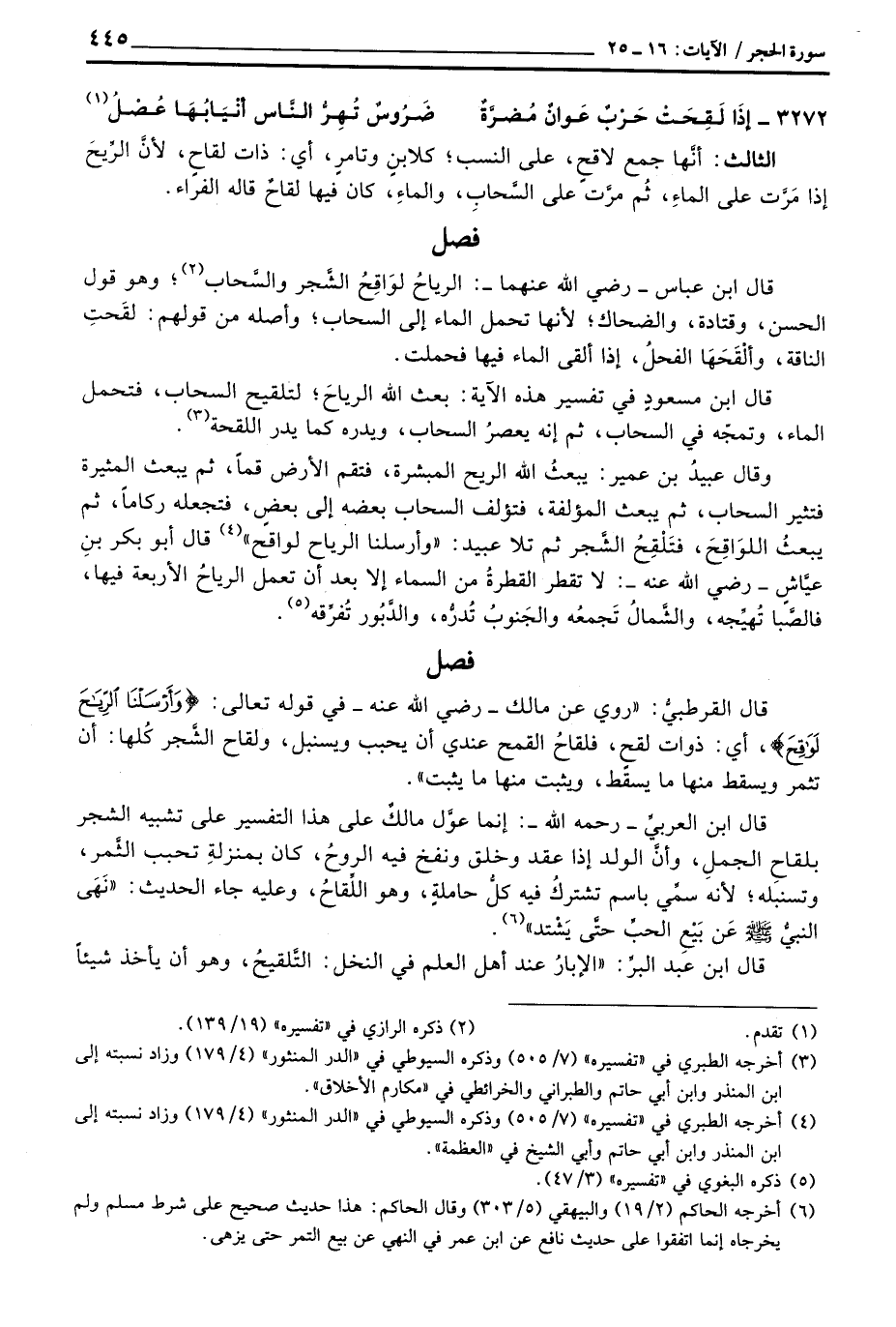 قال القرطبيُّ: «روي عن مالك رَضِيَ اللَّهُ عَنْه في قوله تعالى: {وَأَرْسَلْنَا الرياح لَوَاقِحَ} ، أي: ذوات لقح، فلقاحُ القمح عندي أن يحبب ويسنبل، ولقاح الشَّجر كُلها: أن تثمر ويسقط منها ما يسقط، ويثيبت منها ما يثبت» .